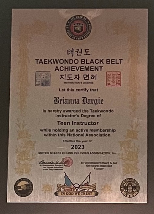 Miss Brianna started at Courageous Kicks Taekwondo at twelve years old under Master Happy Kierstead and has been instructing for three years under Master Happy Kierstead. Miss Brianna works with all ages ranging from to three to sixty-three! She is a Certified Instructor through the United States Chung Do Kwan association. Miss Brianna is scheduled to test for third degree black belt & graduate from high school in 2025. She has adopted the saying "teaching courage on and off the mat through the relationships built through Taekwondo." Miss Brianna also enjoys spending time with her Taekwondo family outside of the school.
