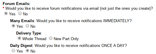 Adjust your email settings for FORUM notifications according to your preferences. We strongly suggest setting your forum emails notifications to YES as this is the main way we communicate to members. However, getting each update immediately vs. a daily digest is up to you.