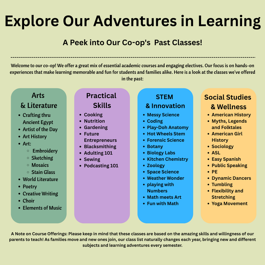 Our co-op provides a structured, enriching educational environment designed for K-12 students, meeting once a week for 10 weeks each semester. The curriculum balances foundational academic subjects with a diverse selection of engaging elective classes, with each semester bringing new and exciting course offerings based entirely on the unique skills and willingness of participating parents to teach.Every parent is expected to volunteer 3 of the 4 periods and must remain on campus for the full duration of their student's schedule. Enrollment requires a $20 registration fee per semester, along with variable class fees covering specific materials and instructional expenses.Please note that these co-op fees are separate and are not included in any general yearly or organizational membership fees. Want to know more check out our Handbook.