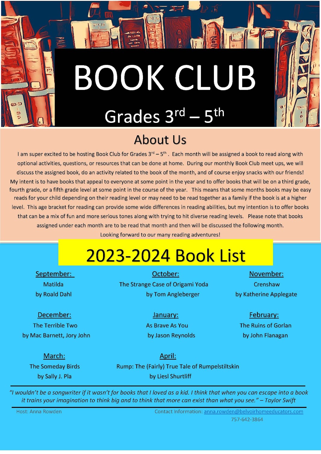 Each month will be assigned a book to read along with optional activities, questions, or resources that can be done at home. During our monthly Book Club meet ups, we will discuss the assigned book, do an activity related to the book for the month, and of course enjoy snacks with our friends! My intent is to have books that appeal to everyone at some point in the yar and to offer bookds that will be on a thrid grade, fourth grade, or fifth grade level at some point in the course of the year. This means that some months may be easy ready for you child depending on their reading level or may need to be read together as a family if the book is at a higher level. This age bracket for reading can provide wide differences in reading abilities, but my intention is fo offer books that can be a mix of fun and more serious tones along with trying to hit diverse reading levels. Please not that books assigned under each month are to read that month and discussed the following month. Looking forward to our many reading adventures!!