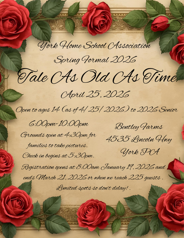 All YHSA teens ages 14 (as of 4/25/2026) through 2026 Senior are invited to attend the 2026 Spring Formal! Each teen may bring up to 1 guest. The guest MUST be ages 14 (as of 4/25/2026) through 2026 Senior.