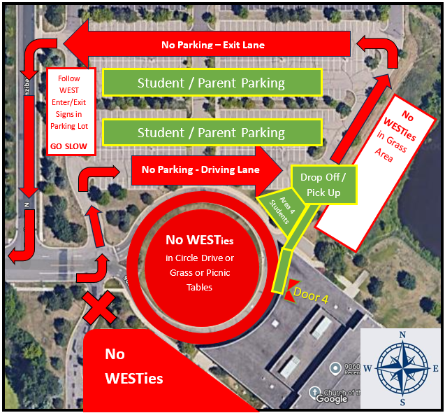 Do NOT Venture onto Pond, Circle Drive or South and East Side of Building