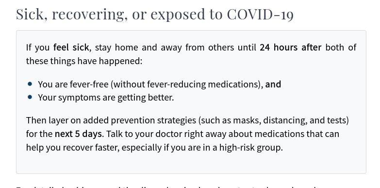 Minimizing ExposureWhat to do if someone is ill or has had a recent exposure to illness:Stay home if you feel ill or have any symptoms. This includes, but is not limited to: fever, muscle aches, shortness of breath, difficulty breathing, loss of taste or smell, gastrointestinal distress, or skin rashes that are not explained by eczema/psoriasis/contact dermatitis. If you or a family member have been exposed to a highly contagious disease, like COVID-19 or influenza, OR if you are experiencing any related symptoms - please follow Minnesota Department of Health recommendations for quarantine, masking, and monitoring. Recommendations as of Fall 2025 are shown below.
