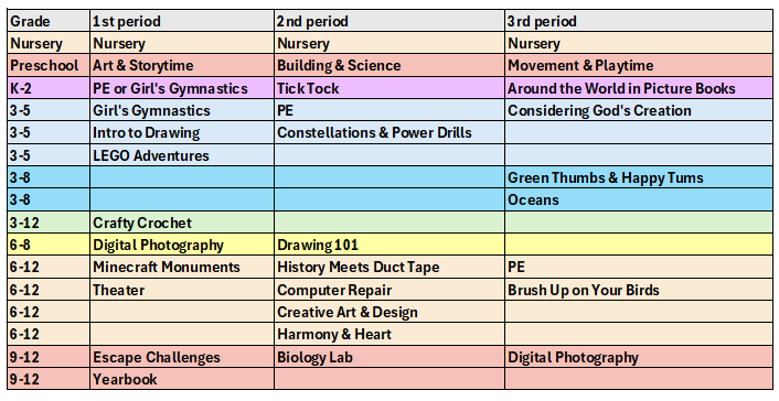 Our classes are taught by parents who have participated in co-op for at least one semester. Each semester, the classes offered are different and are not decided until after family registration is over so that we know how many classes we will need to offer. Nursery is offered each period for babies. Preschool is offered one class per period. K-2 is divided into two equal groups according to age and then offered one class per period. 3rd - 5th, 6th - 8th, and 9th - 12th are each offered 2-4 options per period depending on size of the group. Our classes are influenced by the ideas, talents, and interests of our co-op parents so no two semesters are the same. The following gives you an idea of the types of classes we have had in the past: