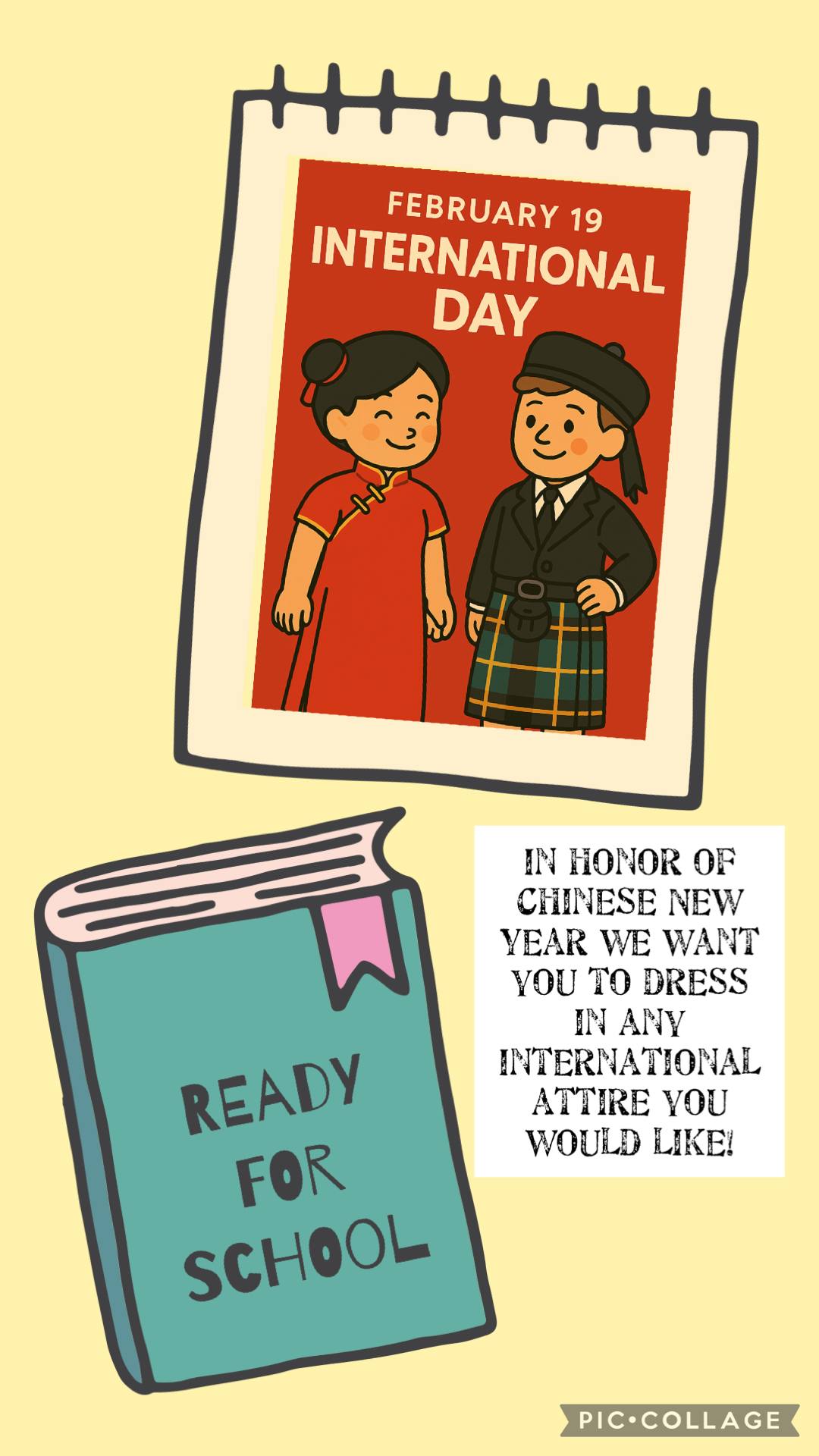 Feb 19 - International Day (Chinese New Year is February 17th. Please dress in any International Attire you would like. Want to wear a Scottish Kilt? Or a Japanese Kimona? Let's see it)