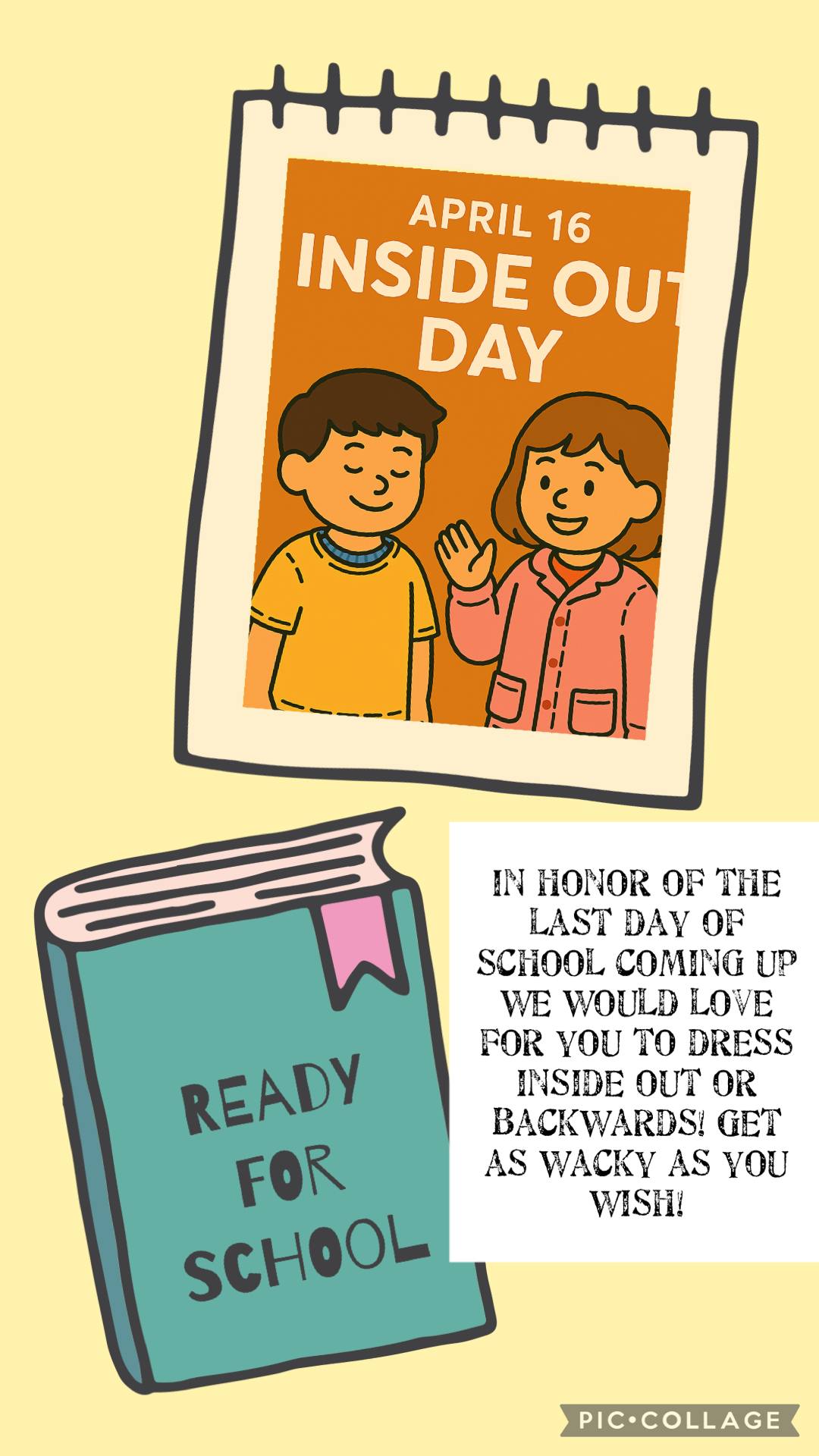 April 16 - Inside Out Day (School is almost out for the year. We are sure you are ready for summer. Let's get crazy! Wear your clothes inside out or backwards! Be as wacky as you wish!)