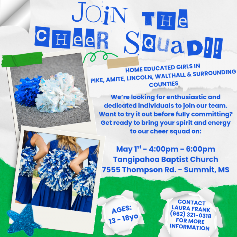 Want to know all the things about cheer? Want to give it a try? Come join us May 1st (4:00 - 6:00pm) at Tangipahoa Baptist Church for a 2hr clinic. NO COST! NO OBLIGATIONS! Aged 13-18 for JV and Varsity Cheer.