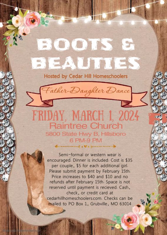 All homeschool girls and their father figure are invited to attend. Semi-formal or western wear is encouraged. Dinner is included.