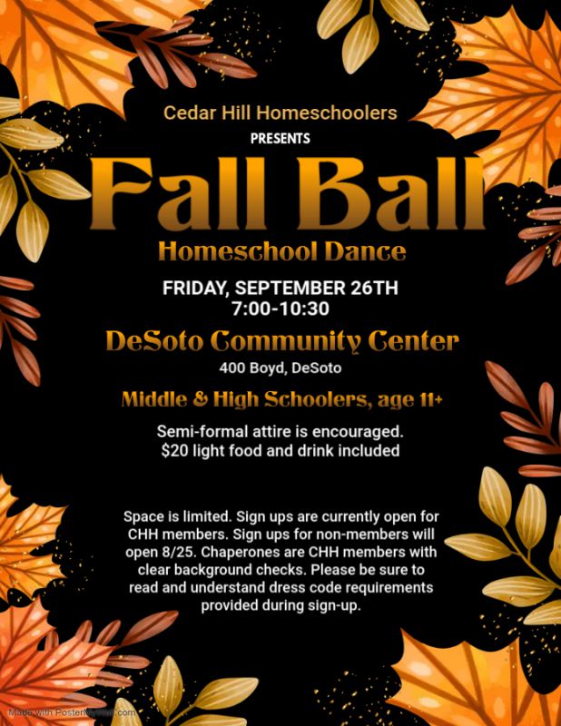 All Middle and High School Homeschoolers, ages 11+, are invited to FALL BALL, CHH's fall dance.