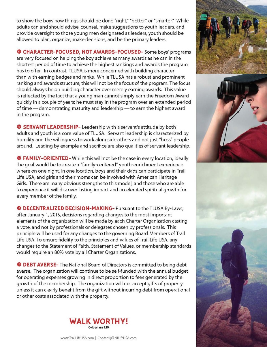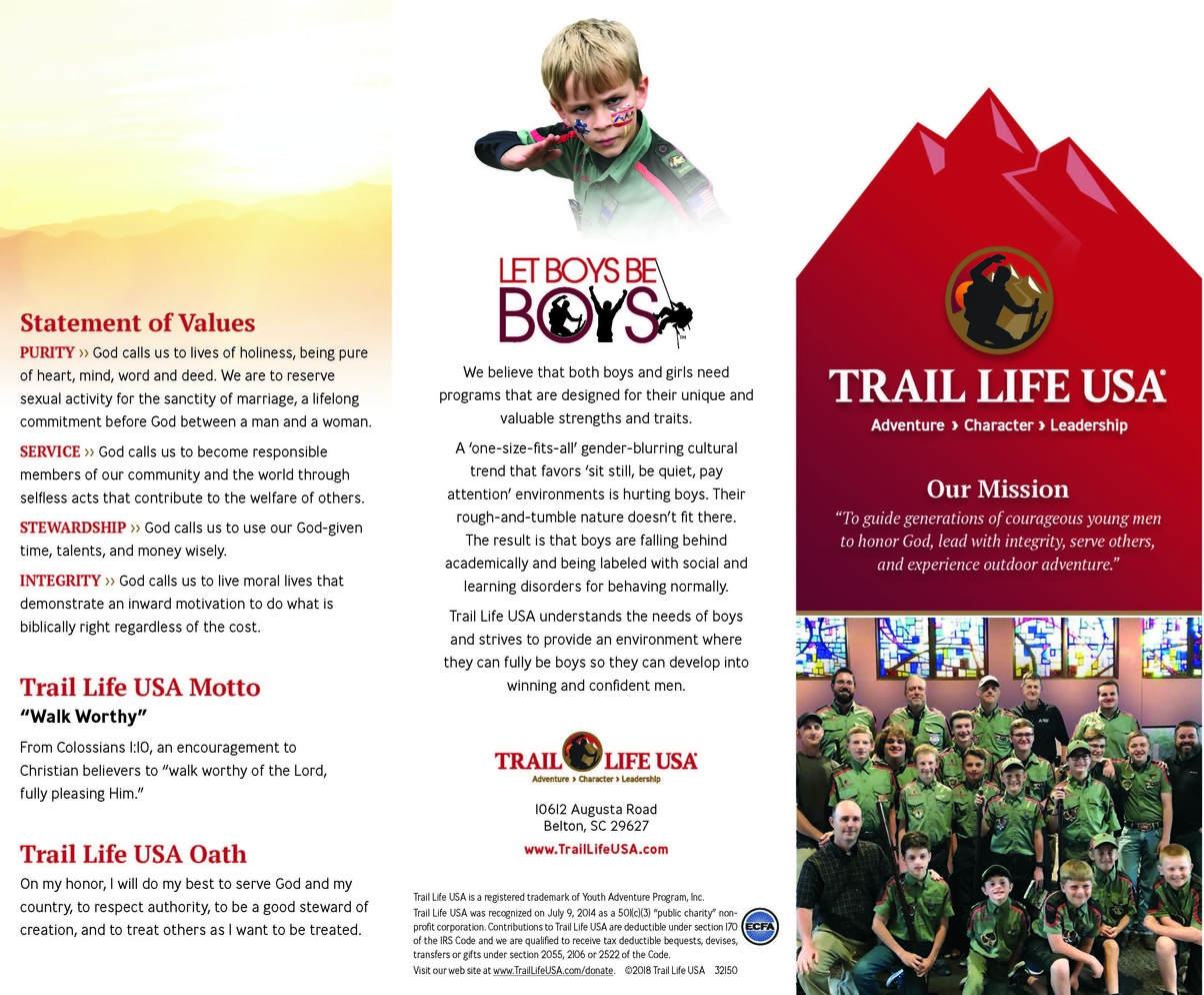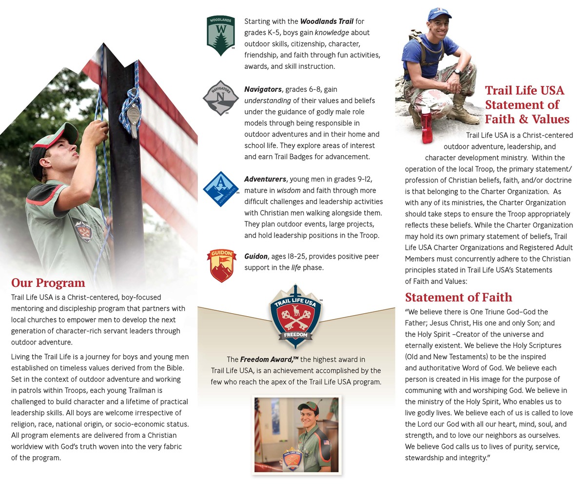 Trail Life USA is a Church-Based, Christ-Centered, Boy-Focused mentoring and discipleship journey that speaks to the heart of a boy. Established on timeless values derived from the Bible and set in the context of outdoor adventure, boys from Kindergarten through 12th grade are engaged in a Troop setting by male mentors where they are challenged to grow in character, understand their purpose, serve their community, and develop practical leadership skills to carry out the mission for which they were created.