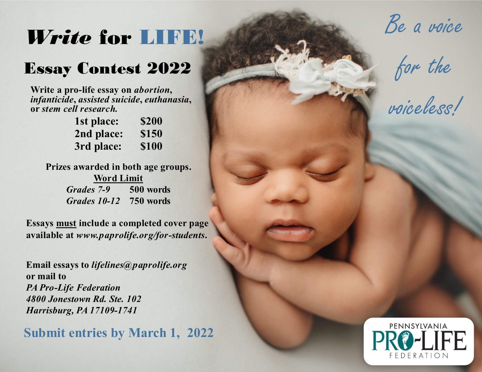 Please consider integrating the Pennsylvania Pro-Life Federation’s essay contest into your curriculum this year. This is not only a rich opportunity to learn, but an exercise that will prepare young people to intelligently discuss important societal issues and defend innocent life.