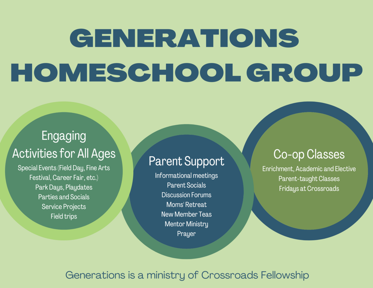Generations Homeschool Group is a ministry of Crossroads Fellowship in Raleigh, NC, that exists in partnership with the local church to encourage and equip Christian families as they educate their children at home. We accomplish this by offering academic enrichment programs, coordinating group activities, and fostering collaboration among our members.