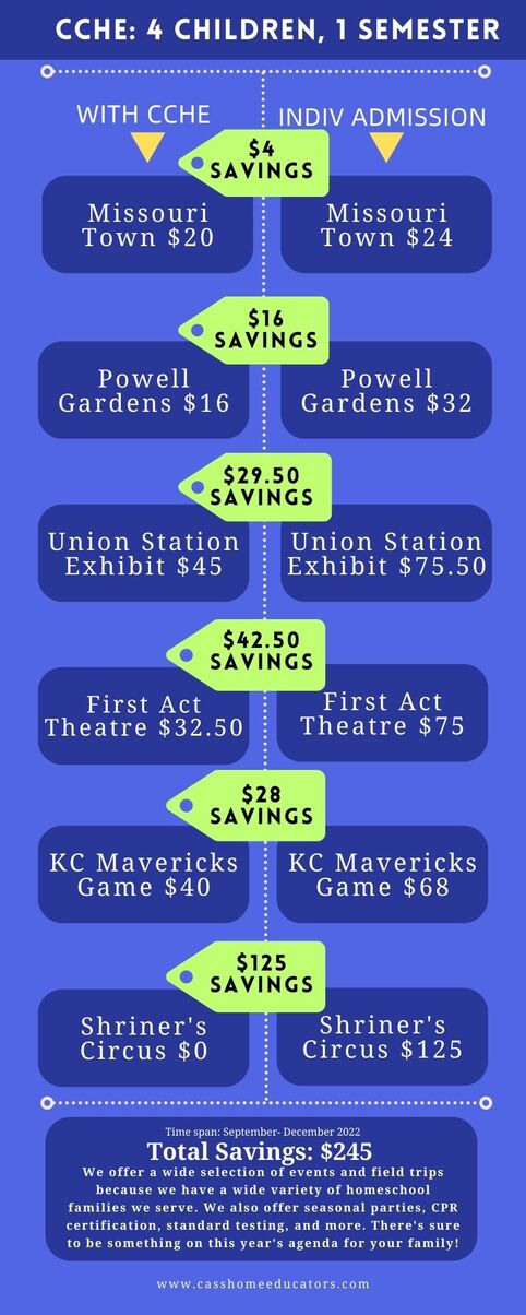 We are Cass County Home Educators, and we welcome all our members on several field trips each month, and hope to save your family money in the process. Our organization is able to access discounted admissions and "field trip" excursions to many fun locations across the metro, our members save a significant amount over the price of admission. Check out our infographic at the bottom of this page for more details.