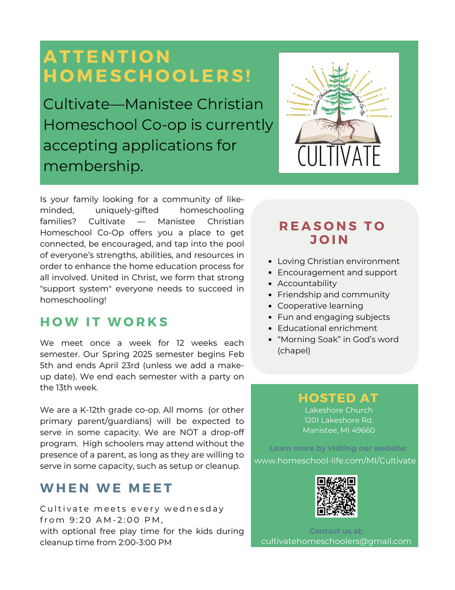 CULTIVATE was founded in 2024 by two homeschool moms who saw the need in their community and wanted to make a difference. They saw that if everyone came together to “toil in the fields,” they could all “reap the blessings.” The co-op is an off-shoot of Manistee Christian Homeschoolers, which is a support group that has been serving the community since 2016. We have completed our first full year of classes; and our second year is ready to sprout soon! We are excited to see what God will do in the future, as he has already been moving in amazing ways to form this group of families!