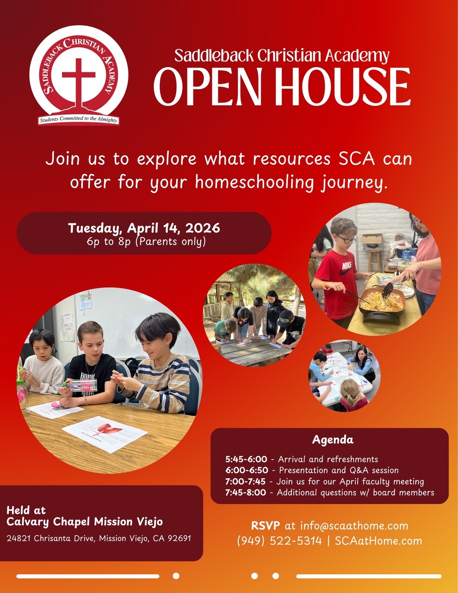 Saddleback Christian Academy offers classes, activities, events and more! Get to know our community. We hope you'll join us. For more information, contact us at info@scaathome.com or 949-522-5314.