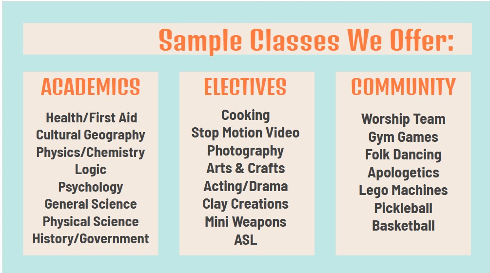 We group our class offerings by grade: 1st-3rd, 4th-7th and 8th-12th. Every term, our classes will vary dependent on the needs and desires communicated by our members.