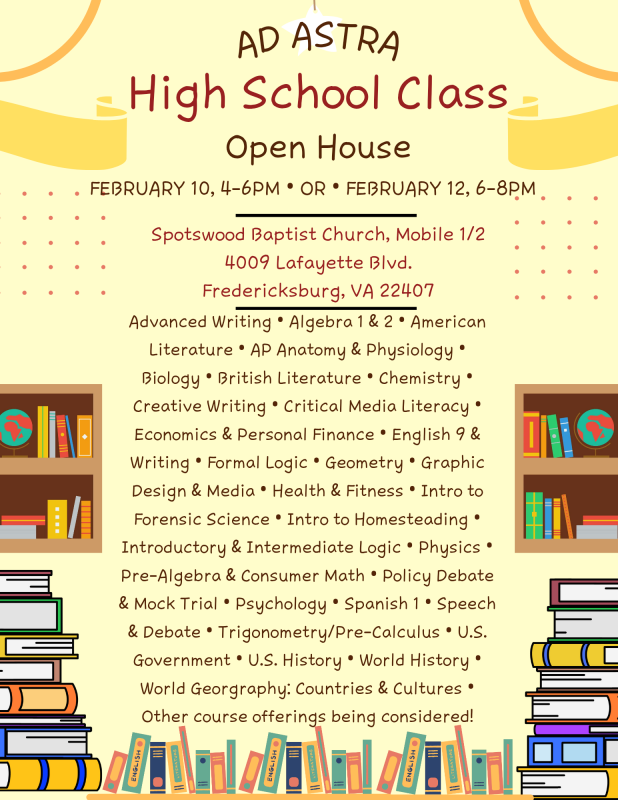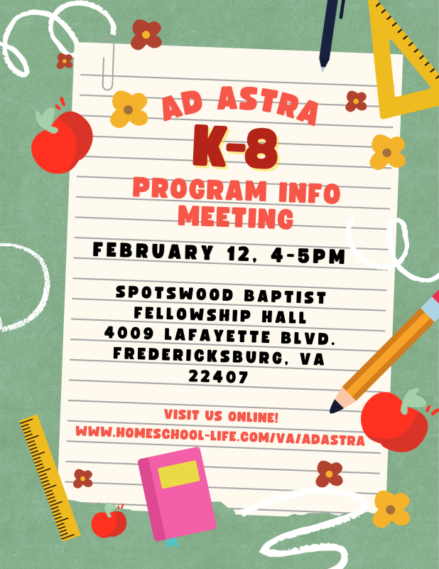 Ad Astra serves the Fredericksburg, VA and surrounding homeschool communities. We offer educational cooperative classes for K5 through 8th grade (with pre-school and nursery for participating families). For high school homeschool families, we coordinate time and space to connect with homeschool tutors to meet the educational needs with a variety of class offereings while providing students with an oppertunity for solid social interactions.